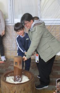 ももたろうが旅立つ時におじいさんおばあさんがあげた、きびだんごのように、お家の方が作ったお餅で力をつけて小学校へ行ってほしいと願っています。